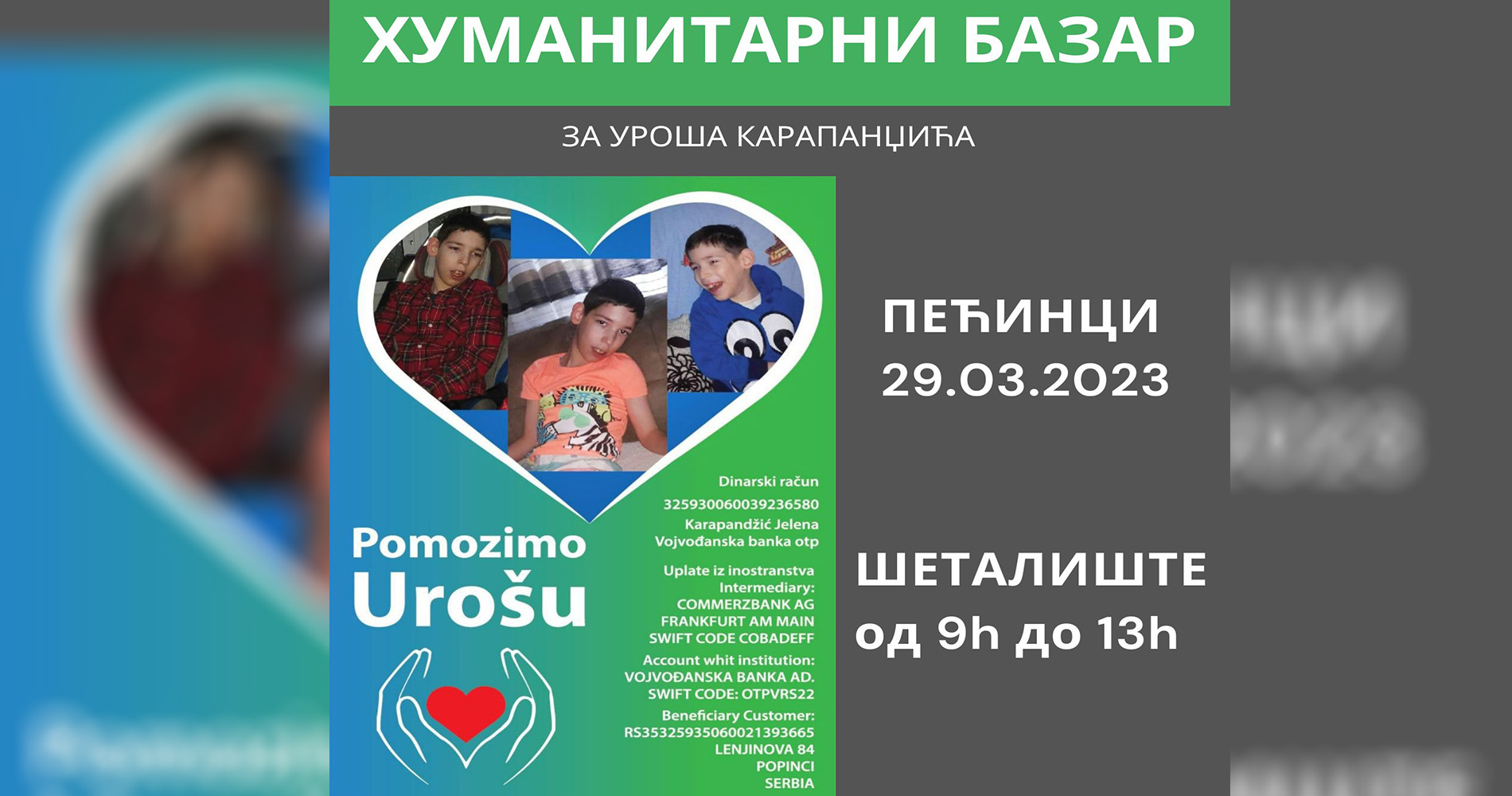 Сав новац прикупљен од продаје намењен је за наставак лечења тринаестогодишњег Уроша Карапанџића из Попинаца који 11. маја ове године у Бечу има заказану операцију.