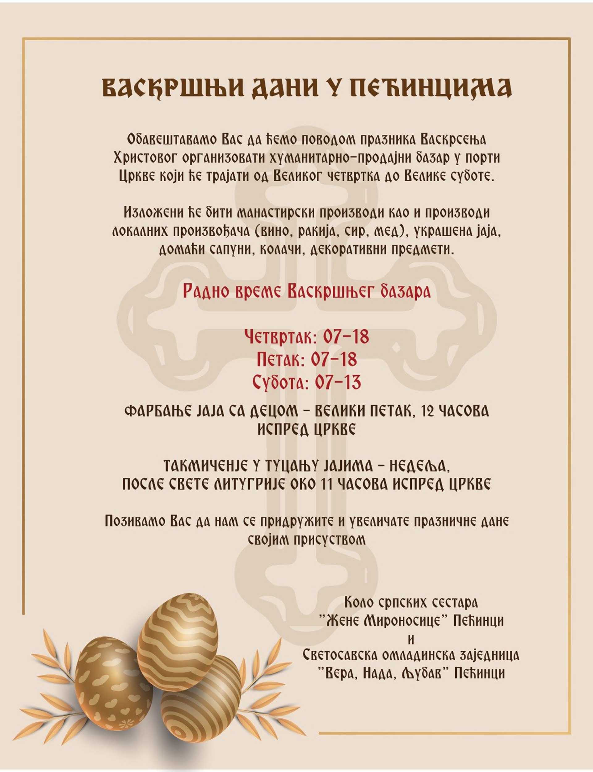 Светосавска омладинска заједница (СОЗ) и Коло српских сестара при Архијерејском намесништву пећиначком организује четвородневни Ускршњи базар на пећиначком тргу. Базар ће бити хуманитарно-продајног карактера, а биће изложени манастирски производи, као и производи локалних произвођача, украшена јаја, домаћи сапуни, колачи и декоративни предмети.