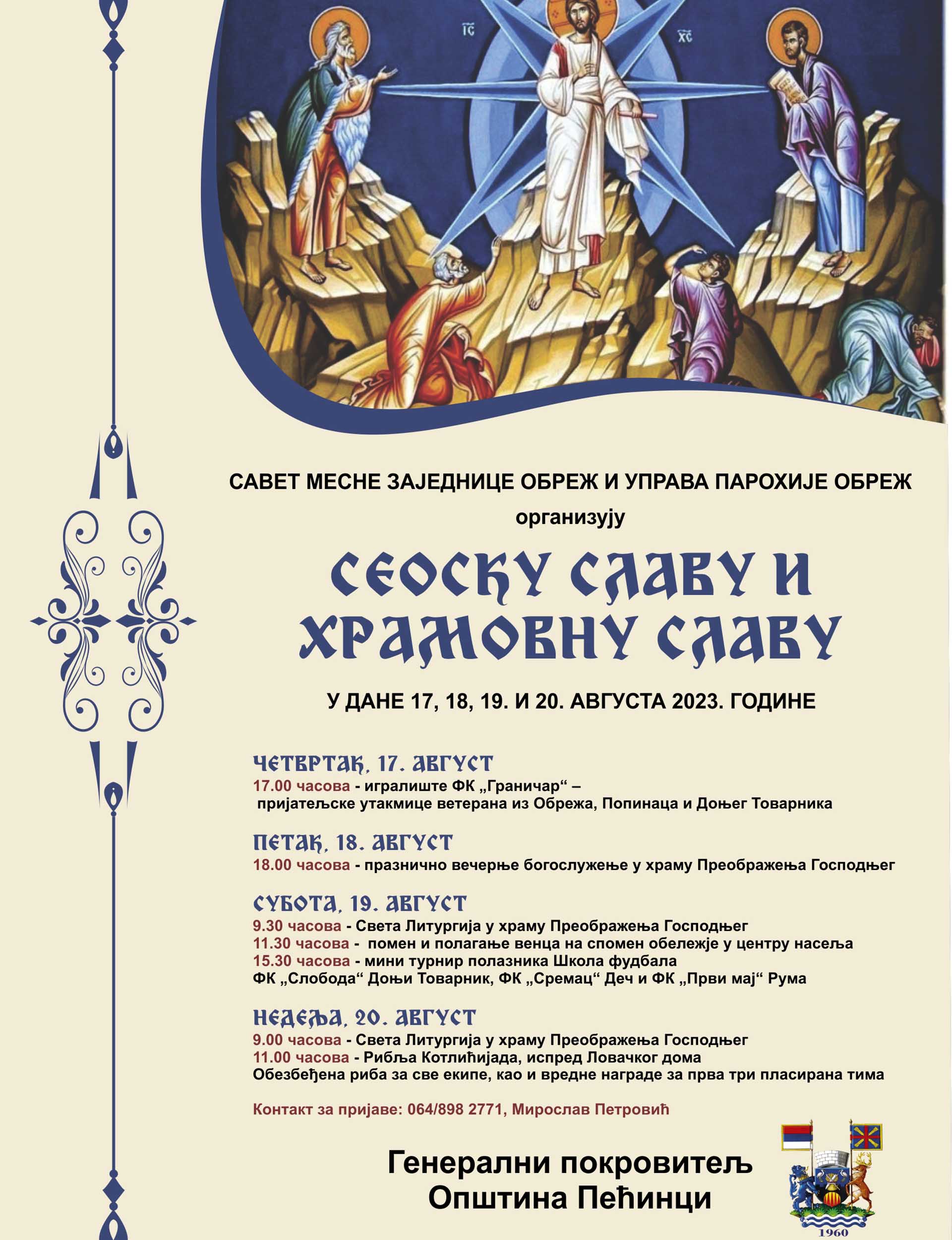 Савет месне заједнице Обреж, у сарадњи са управом парохије Обреж, организује сеоску славу под покровитељством Општине Пећинци.