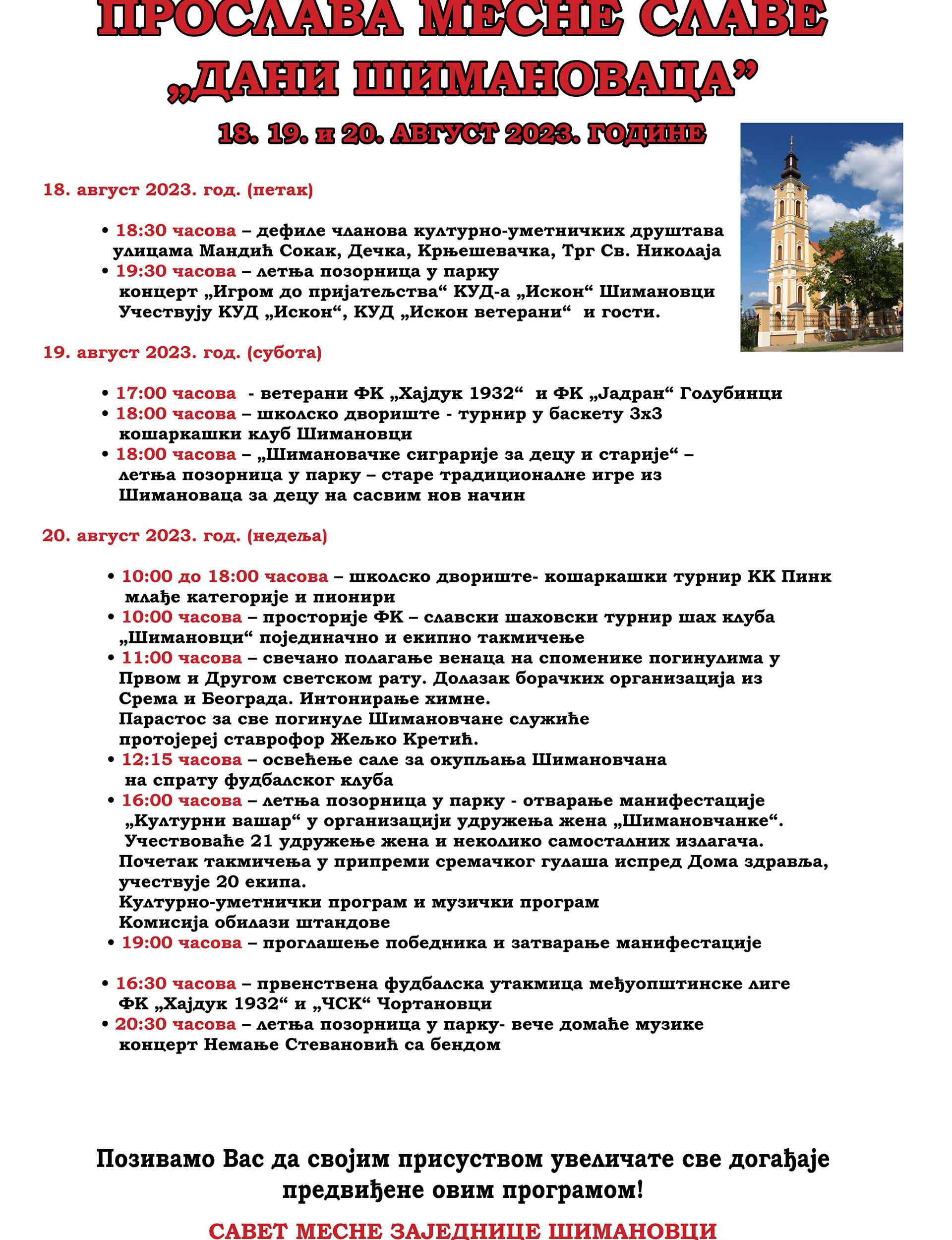Богат програм очекује Шимановчане и њихове госте за сеоску славу. Савет месне заједнице овог насеља, у сарадњи са Културним центром Пећинци, а под покровитељством Општине Пећинци, огранизује програм обележавања славе, обједињен у тродневну манифестацију под називом „Дани Шимановаца“.