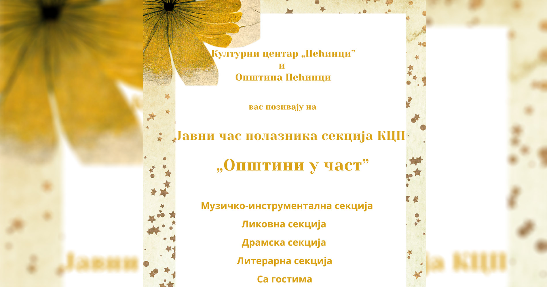 У сали пећиначког Културног центра у среду, 22. маја, са почетком у 19.00 часова, биће одржан јавни час полазника музичко-инструменталне, литерарне и драмске секције са гостима под називом „Општини у част“, у организацији пећиначког Културног центра под покровитељством пећиначке локалне самоуправе.