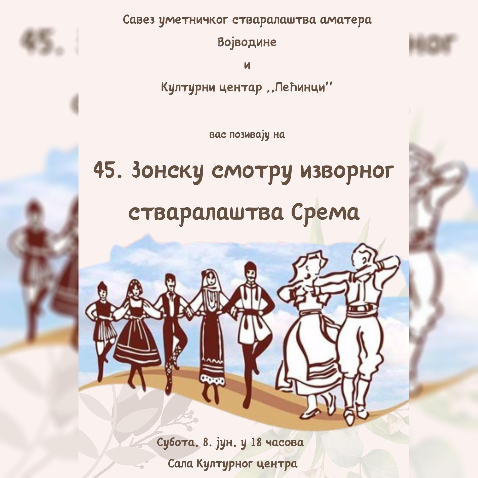 Зонска смотра фолклорних традиција Срема биће ове године одржана 45. пут у суботу, 8. јуна, од 18.00 часова, у Културном центру Пећинци.
