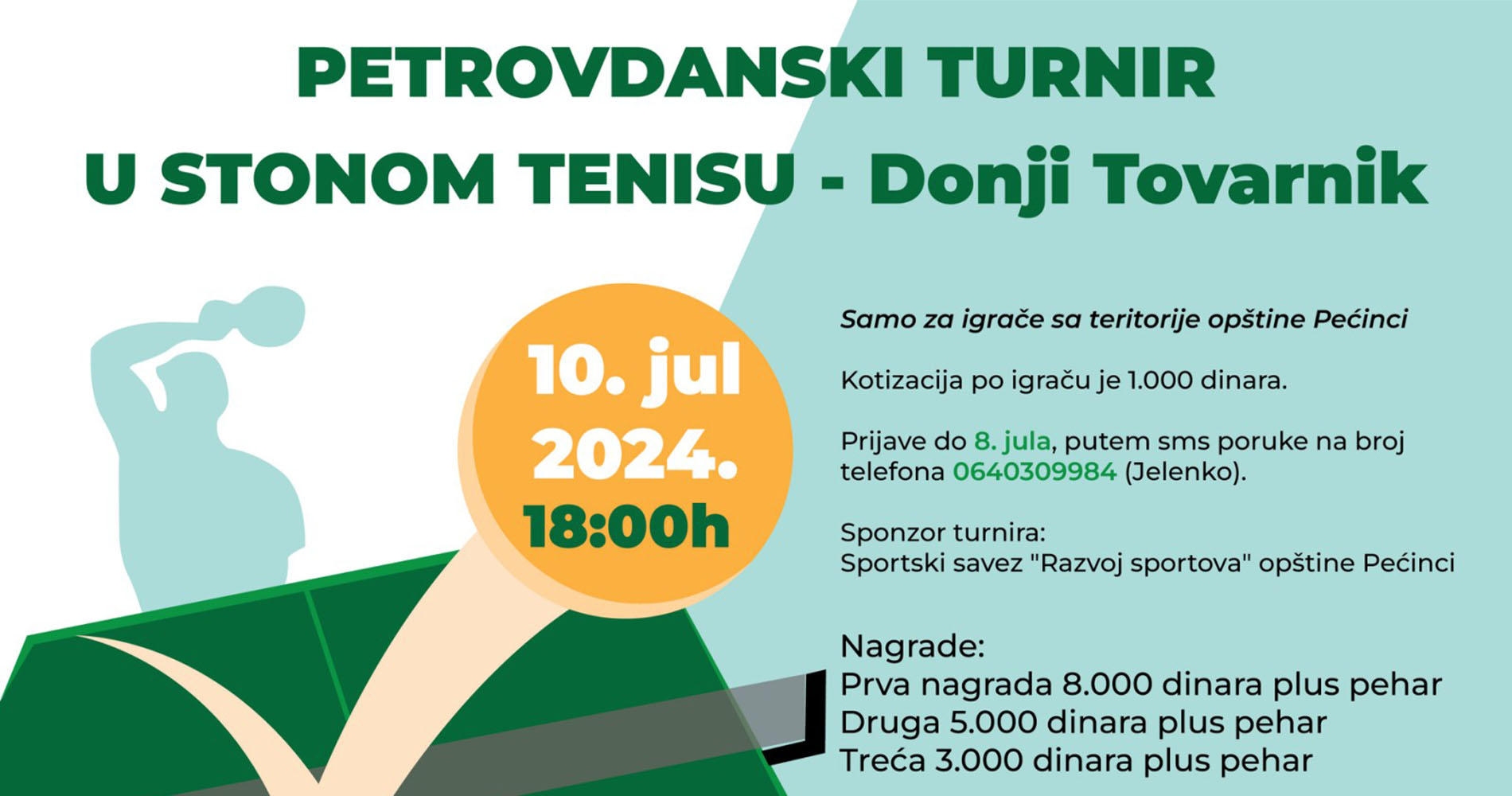 У Спортској хали у Доњем Товарнику, у среду 10. јула, у 18.00 часова, биће одржан Петровдански турнир у стоном тенису, у организацији Спортског савеза „Развој спортова“ а под покровитељством Општине Пећинци.