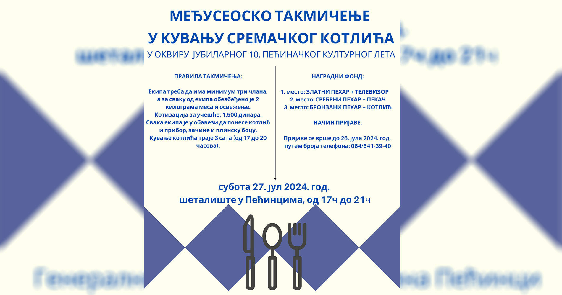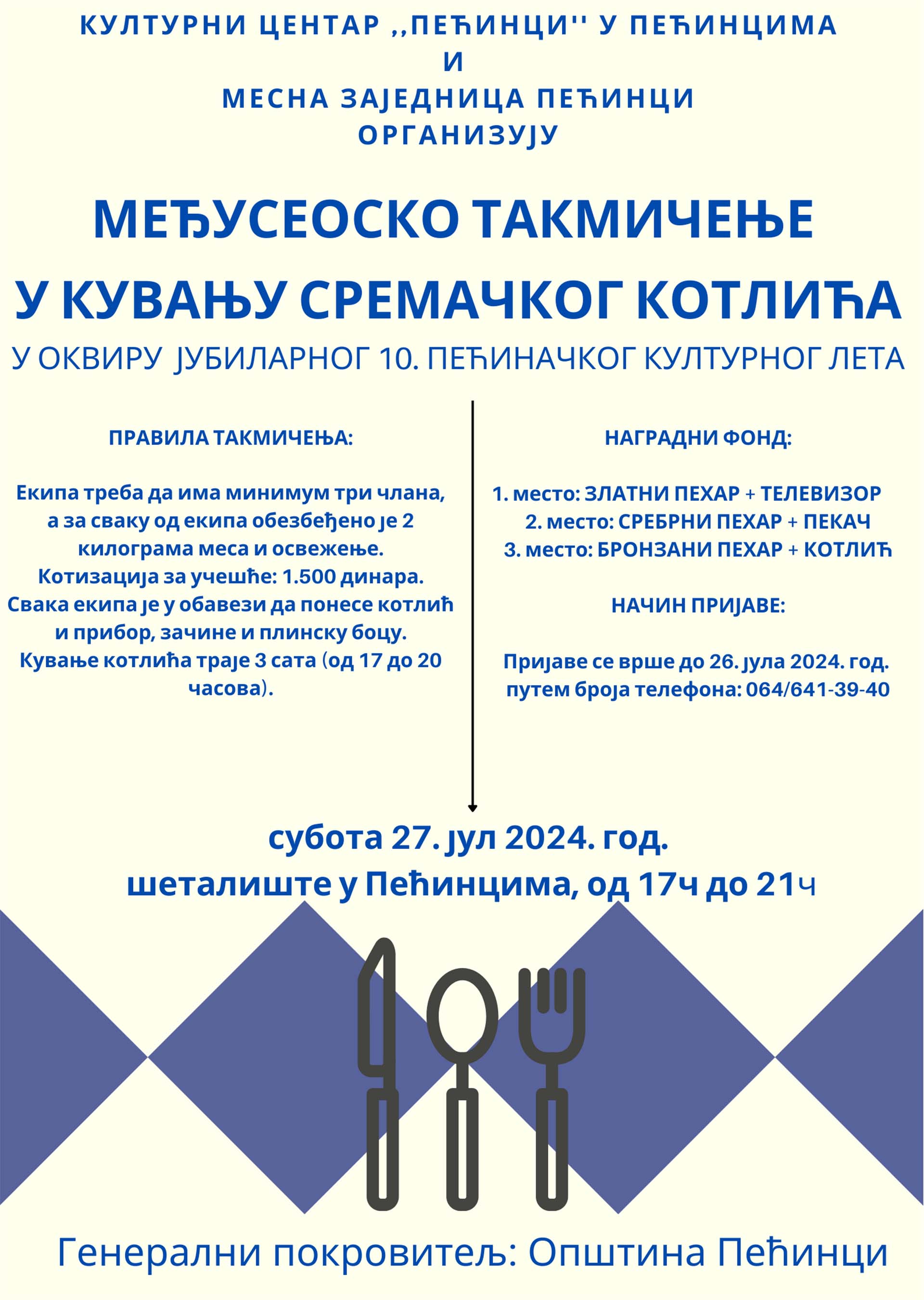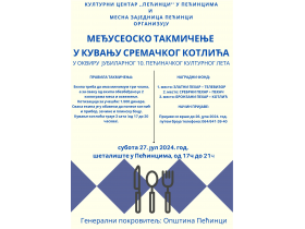 Културни центар “Пећинци” у Пећинцима у сарадњи са Саветом месне заједнице Пећинци организује Међусеоско такмичење у кувању сремачког котлића које ће се одржати у суботу 27. јула на шеталишту у Пећинцима од 17.00 часова у оквиру јубиларног, 10. Пећиначког културног лета.