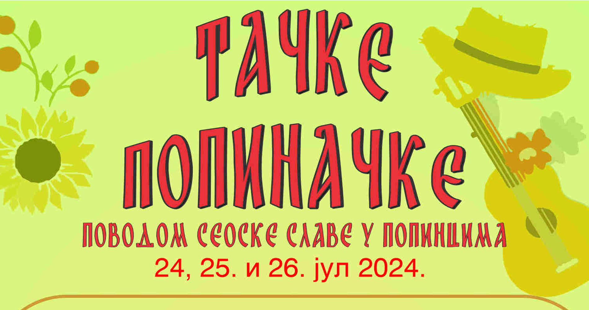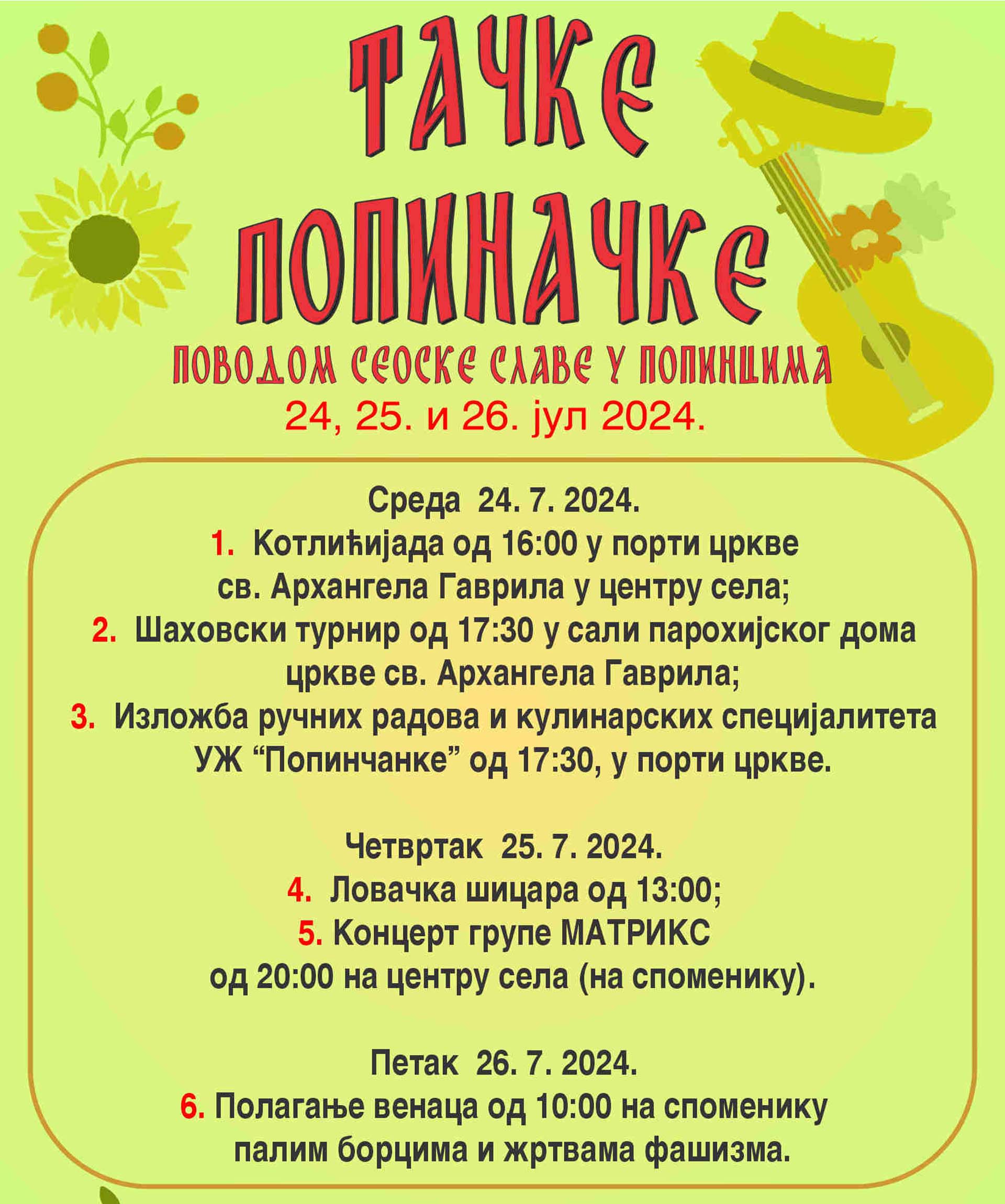 Програм обележавања почиње у среду, 24. јула, када ће од 16.00 часова, у порти месног храма, бити одржана Котлићијада, а од 17.30 часова, у сали парохијског дома биће одржан шаховски турнир. У исто време, у порти цркве, за љубитеље гастрономије и старина, УЖ “Попинчанке” припремиле су изложбу ручних радова и кулинарских специјалитета.