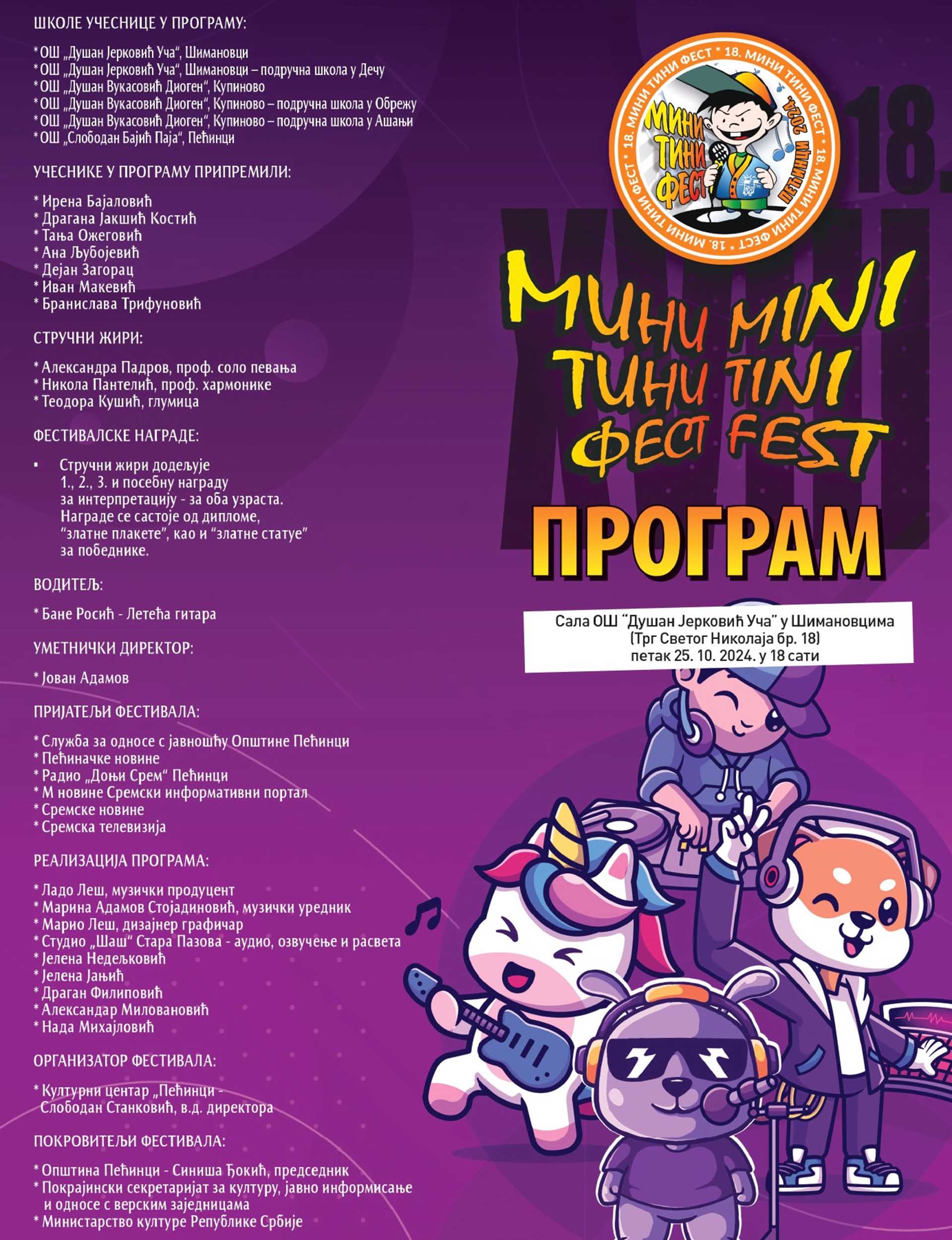 Дечји фестивал „Мини-тини фест“, у организацији пећиначког Културног центра под покровитељством Општине Пећинци, Покрајинског секретаријата за културу, јавно информисање и односе с верским заједницама и Министарства културе Републике Србије, ове године одржаће се по 18. пут у петак 25. октобра у сали ОШ “Душан Јерковић Уча” у Шимановцима са почетком у 18.00 часова.
