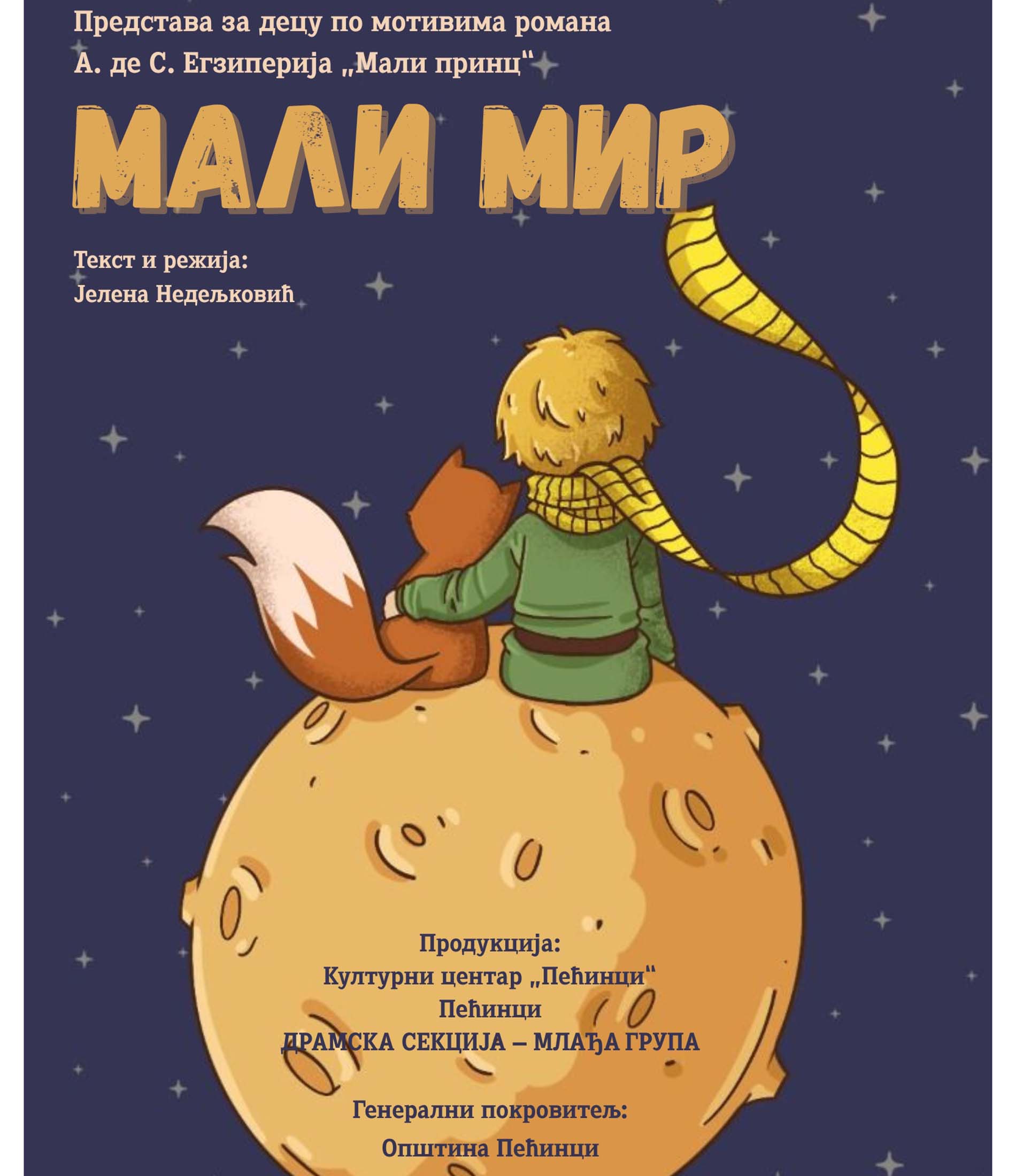 Режију потписује Јелена Недељковић, а улогама и сценском игром представу оживљавају чланови млађе групе Драмске секције Културног центра „Пећинци“. Представа се изводи у оквиру Зонске смотре дечијег сценског стваралаштва Срема и доноси нежну, поетску и дирљиву причу о пријатељству, љубави и важним животним вредностима виђену очима детета.