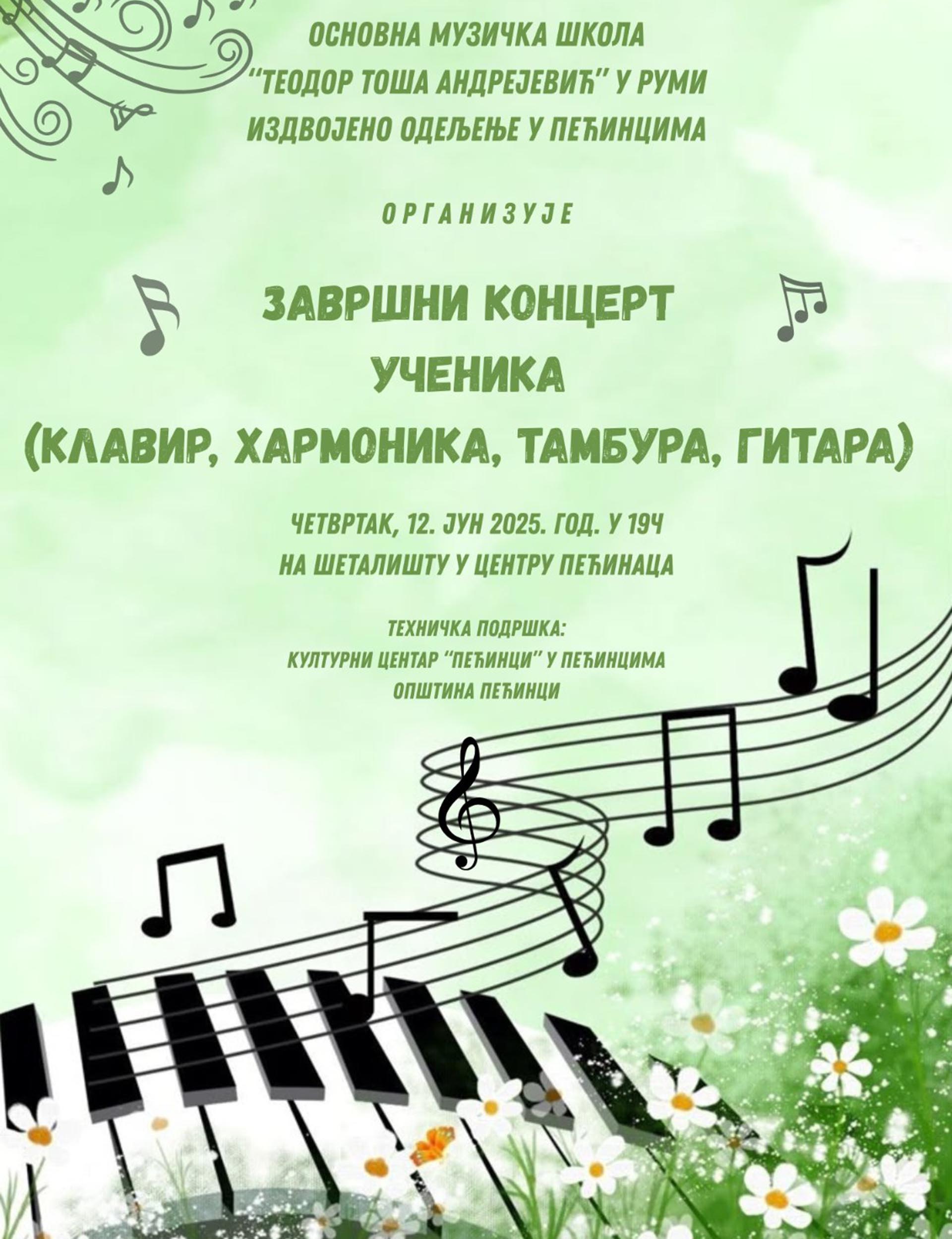 Завршни концерт пећиначког одељења Основне музичке школе,,Теодор Тоша Андрејевић“ из Руме, биће одржан у четвртак, 12. јуна, на шеталишту у Пећинцима.